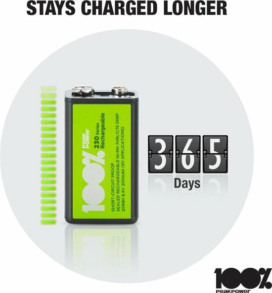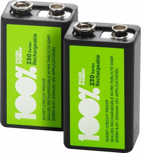 9 volt blokbatterij (voltage 8.4V) , hoge capaciteit, Ready2use – Vooraf opgeladen en klaar voor gebruik voor uw gemak. Zeer duurzaam voor jarenlang hergebruik. De batterijen hebben een zeer geringe zelfontlading en blijven opgeladen, zelfs wanneer ze niet worden gebruikt, dankzij de LowSelfDischarge (LSD)-technologie. Dankzij geavanceerde batterijtechnologie, geen geheugeneffect, zelfs niet bij veelvuldig, gedeeltelijk opladen.