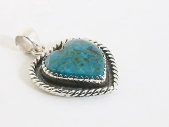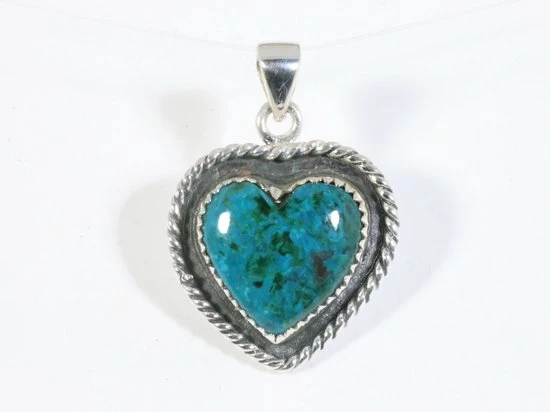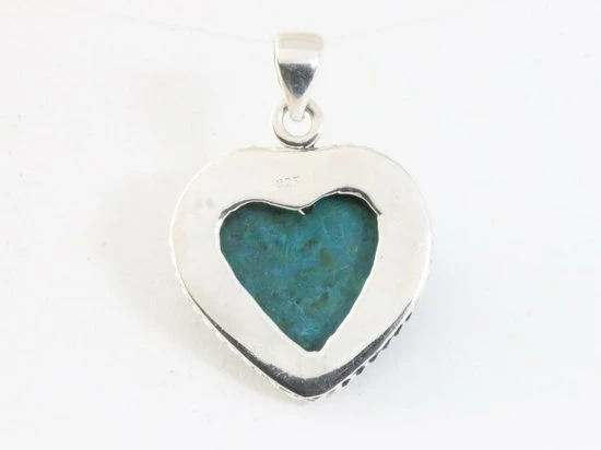 Handgemaakte en fijn bewerkte zilveren hanger in de vorm van een hart, fraai ingelegd met een mooie cabochon geslepen blauw/groene chrysocolla steen. Het zilvergehalte is 925.