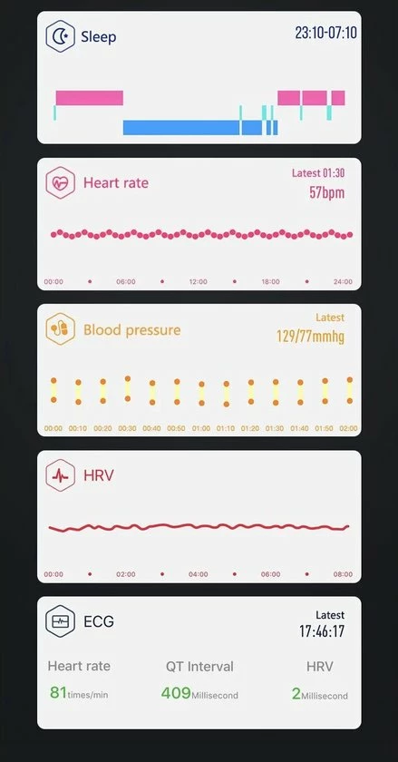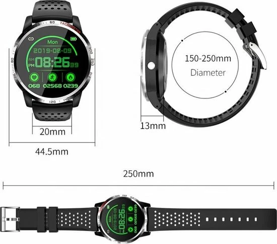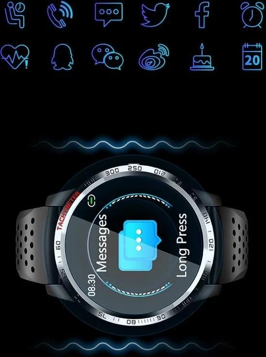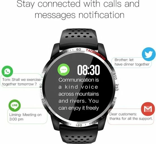 De Belesyยฎ Tachy smartwatch heeft een mooie ronde metalen behuizing en aan de achterkant voorzien van huidvriendelijke kunststof. De afmeting van bijna 45 mm geeft een luxe uitstraling en heeft ondanks de grootte een licht draagcomfort. Je kunt kiezen uit vijf wijzerplaten van topklasse ontwerp. Op het grote TFT kleurenscherm met mooi scherp beeld kun je legio functies kiezen zoals: