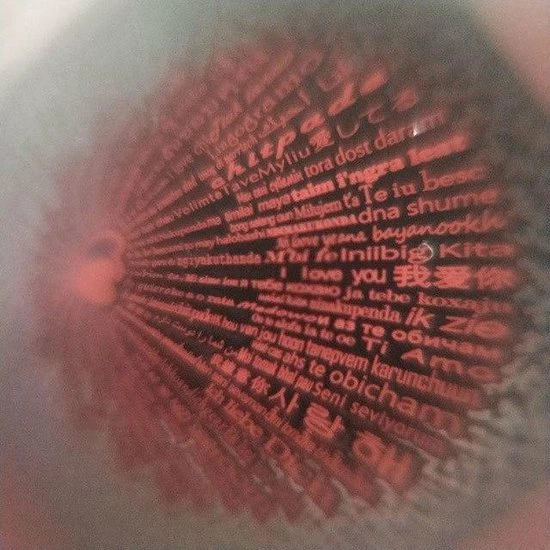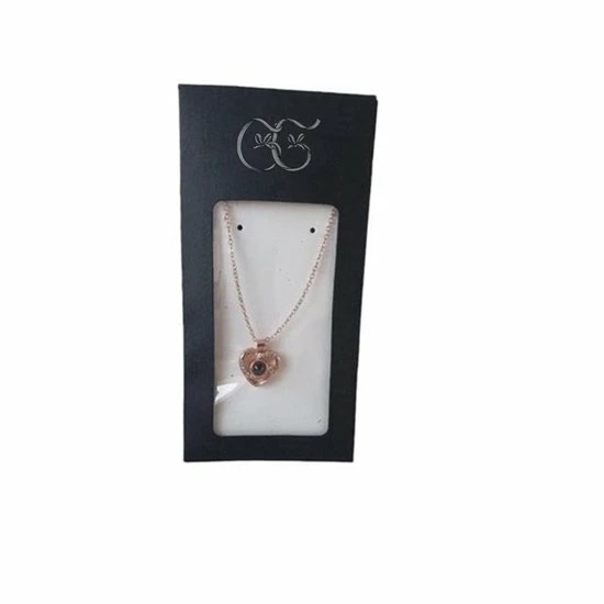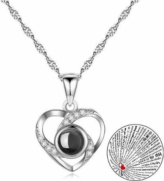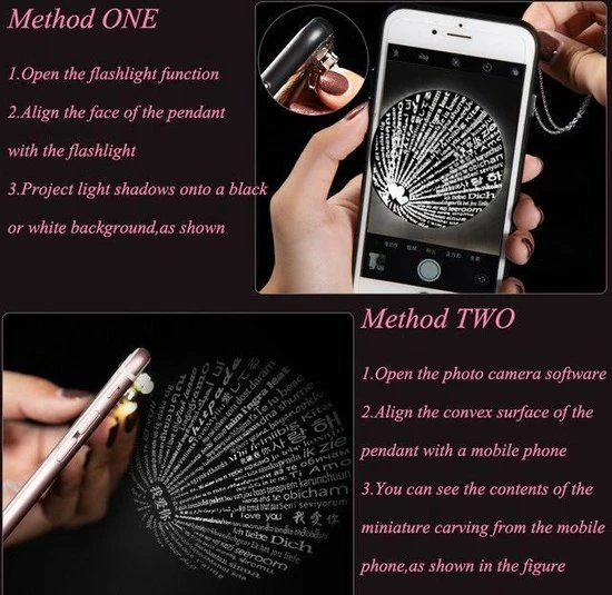 Door simpel weg uw telefooncamera in het oog van het ketting te plaatsen ziet u in 100 talen het zinnetje “Ik hou van je” geschreven. Als u flits schijnt aan de achterkant van het ketting dan kunt u het beeldje waarop “Ik hou van je” in 100 staat projecteren op een muur!