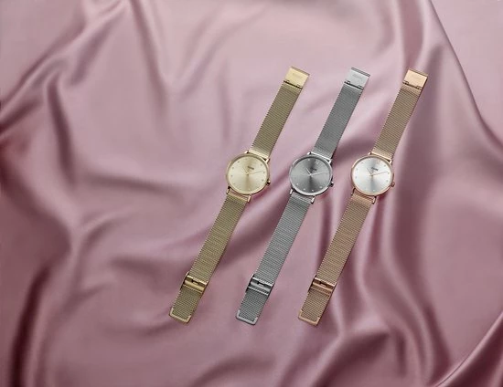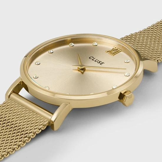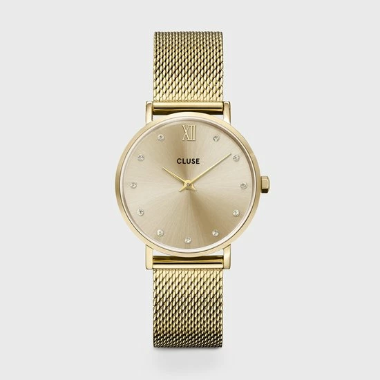 Dit horloge heeft een goudkleurige kast met een diameter van 33mm, een goudkleurig mesh bandje en een champagnekleurige sunray wijzerplaat bezet met zachtgele kristallen. Net zoals bij alle horloges in de Minuit-collectie kun je de bandjes van dit horloge gemakkelijk vervangen door een ander horlogebandje van CLUSE van 16 mm.