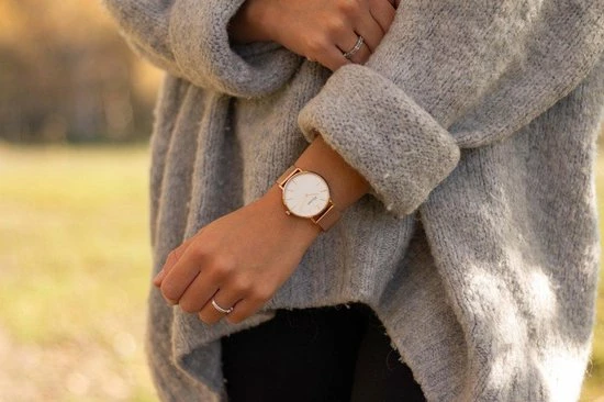 Deze horloge heeft een witte wijzerplaat in een rosé gouden kast van 36 mm. Het ontwerp van dit uurwerk is elegant en minimalistisch.