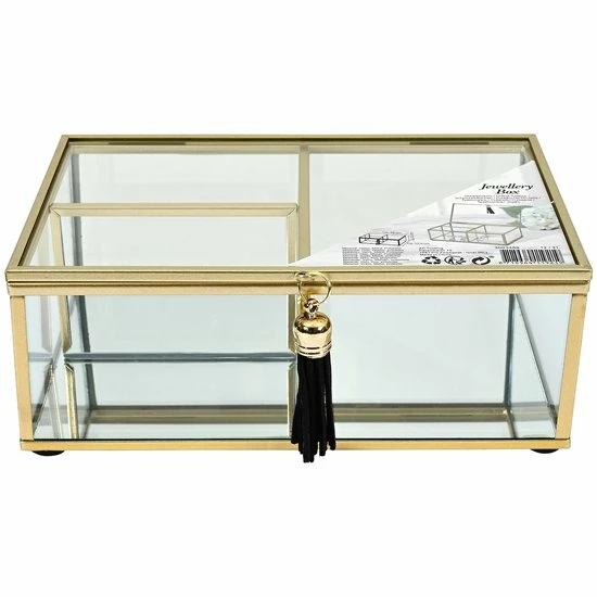 | Verpakkingsinhoud | Luxe, Glazen, Sieradendoosje, -, Metalen, Frame, -, Goud, -, 18, x, 12.5, x, 6.5, cm |