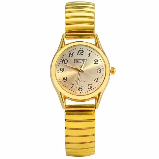 Een klassiek dameshorloge met een ronde kast van 29mm en een stevige elastische metalen band. Het horloge is uitgevoerd in de chique goudkleur. Het horloge heeft duidelijke cijfers op de goudkleurige wijzerplaat en is tevens voorzien van een secondewijzer. Door de 12mm brede verende band past het horloge om bijna iedere damespols.