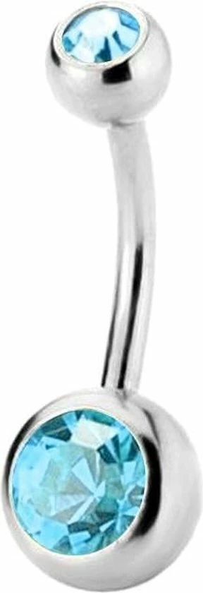 Deze zilverkleurige navelpiercing is gemaakt van 316L Chirurgisch Staal & Kristal. Beide balletjes zijn voorzien van een gekleurd steentje. De balletjes hebben een grootte van 5 en 8 mm. en het kleine balletje is voorzien van schroefdraad voor een eenvoudige bevestiging.