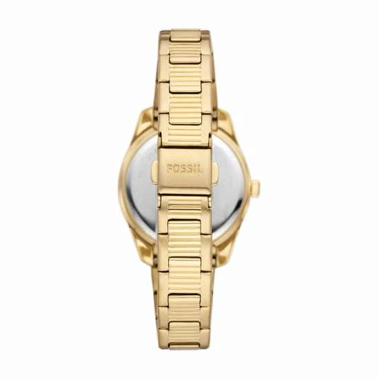 Dit Scarlette horloge van 32 mm heeft een bruine sunray-wijzerplaat, een uurwerk met drie wijzers en dag-datum en een goudkleurige roestvrijstalen armband.