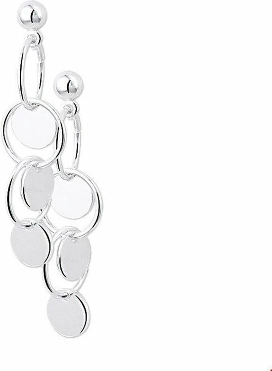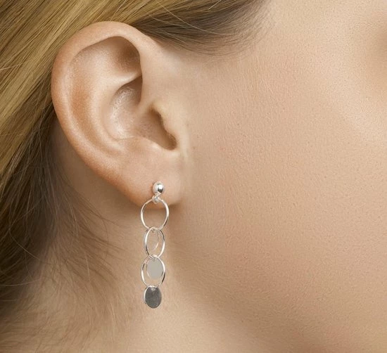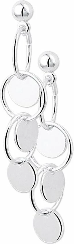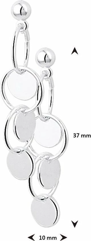 925 Zilveren oorhangers met cirkels en plaatjes en een gepolijste afwerking. De totale lengte van de oorhanger is 3,7cm, de breedte van de cirkels 1cm.
