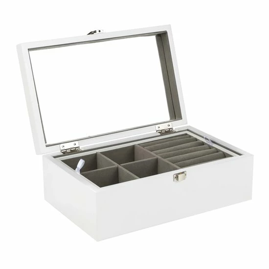 Met de sieradendoos van HI ruim je gemakkelijk jouw sieraden op in een mooie houtgelakte doos. De sieradendoos beschikt na de 4 vakken, ook over 6 ringstokken. Zo raak geen sieraden kwijt en heb je ze allemaal op één plek opgeborgen!