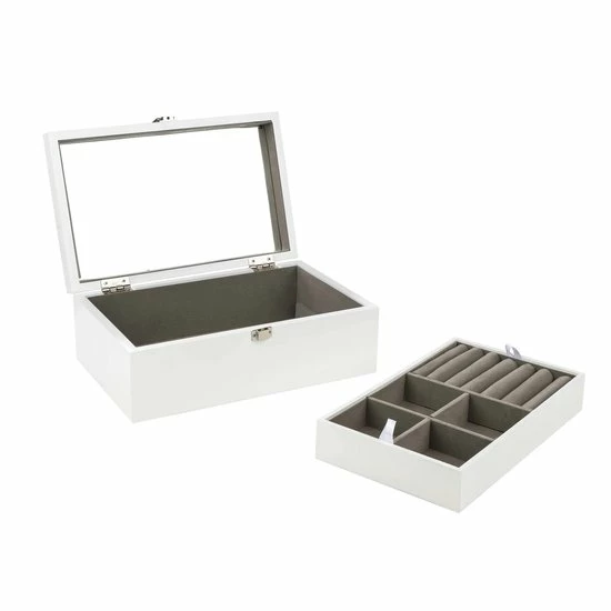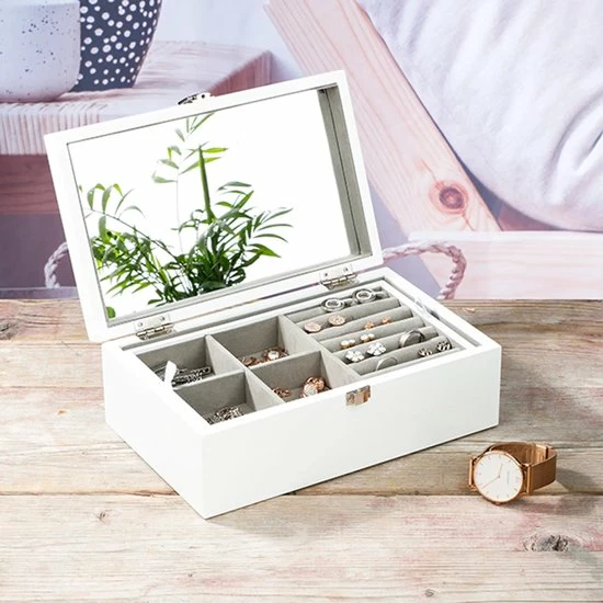 De HI Sieradendoos beschikt over 4 vakken en 6 ringstokken. In de vakken kan je bijvoorbeeld jouw kettingen of oorbellen in kwijt. De 6 ringstokken zijn speciaal bedoelt voor de ringen. Aan de hand van de grootte, kan je hier tot wel 24 ringen in kwijt! Aan de binnenkant van de sieradendoos zit een spiegel, zodat je gelijk kan kijken hoe ze staan.