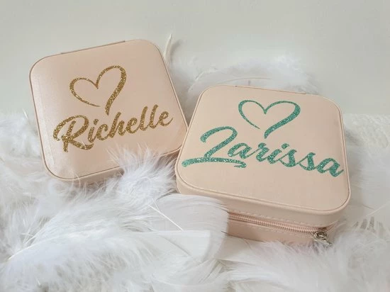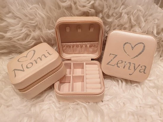 Luxe Sieradendoosje zalm roze met naam. Om je sieraden mooi in op te bergen. Ook gemakkelijk om je sieraden mee te nemen op vakantie.