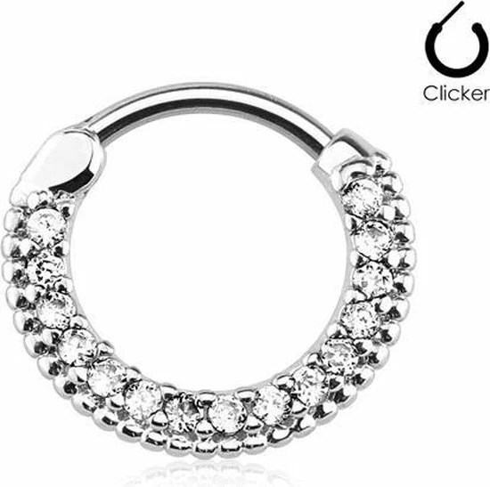 De Jewelled ronde top wit helix Clicker is een toffe helix piercing clicker gemaakt van Chirurgisch Staal 316L ingelegd met ca vijftien schitterende kristalletjes. Je doet de helix Clicker gemakkelijk in zoals de naam al doet vermoeden met behulp van een klik mechanisme. Je klikt het staafje open doet de piercing in en klikt de Septum Clicker vervolgens weer gemakkelijk dicht.