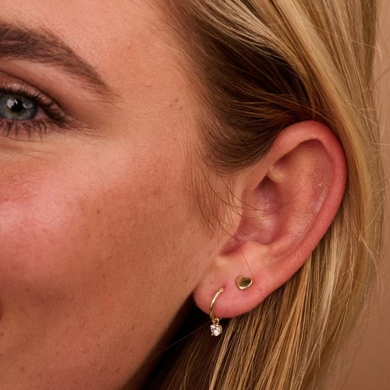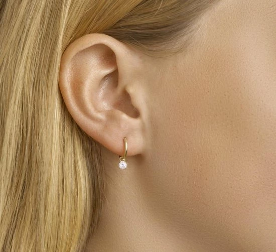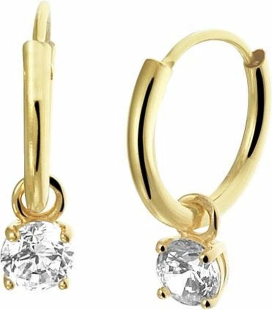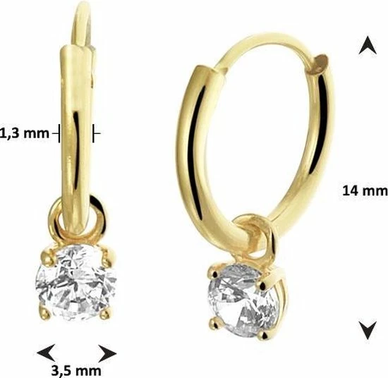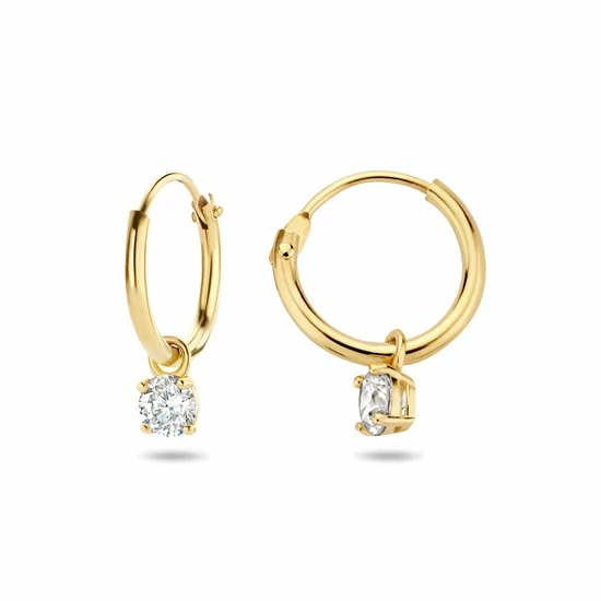 Trendy 14k geelgouden oorringen met een schitterende zirkonia in een chaton. De oorringen hebben een afmeting van 11×1.3mm met een hanger van 5.5×3.5mm.