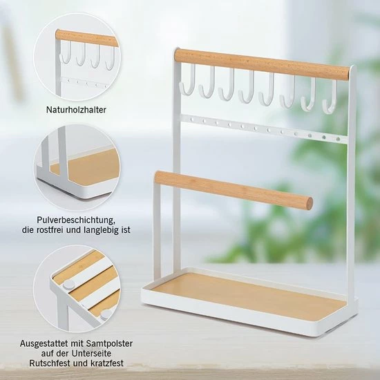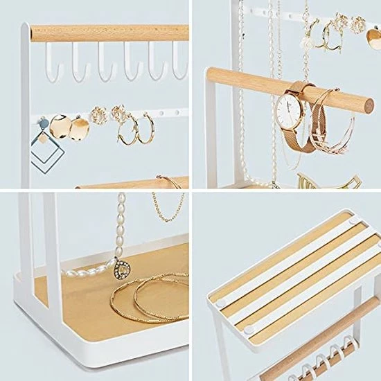 - Perfecte decoratie voor de slaapkamer: de sieradenhouder heeft een uniek en eenvoudig design, de witte houten sieradenstandaard is geschikt voor slaapkamer, bureau, nachtkastje, badkamer, moderne make-uptafel, accessoires, esthetiek van eenvoudig. De sieradenstandaard maakt je kamer eleganter, opgeruimder en gezelliger. De sieradenhouder is eenvoudig in stijl en is je perfecte sieradenorganizer.