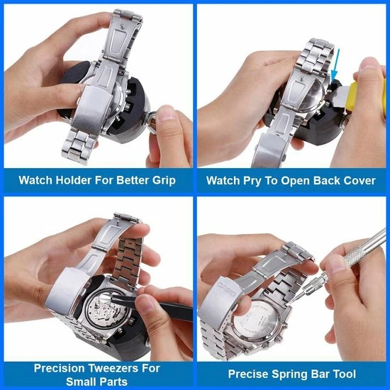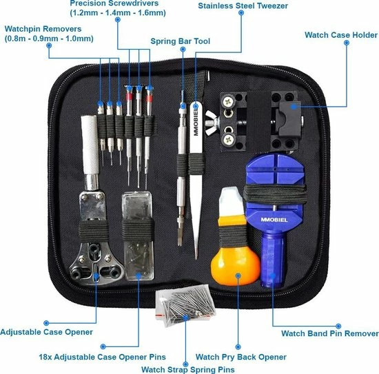 - Het is een alles-in-1 pakket inclusief een handig opbergmapje. Ideaal voor het vervangen van zegels/pakkingen, vervangen van batterijen, of het verstellen/inkorten van horlogebanden.