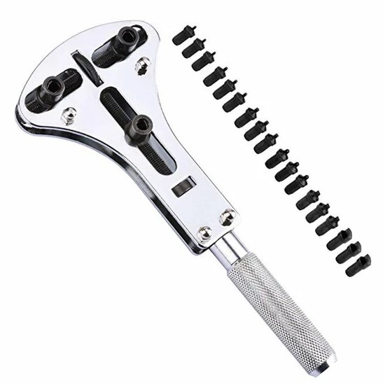 - Een horlogereparatie set voor iedere beginnende horlogemaker, juwelier of horlogeliefhebber. Deze set bestaat uit 13 tools die het mogelijk maken een horloge open te maken of te repareren. Zo beschikt deze set over verschillende horloge schroevendraaiers, maar ook andere attributen voor het repareren van horloges zijn aanwezig.