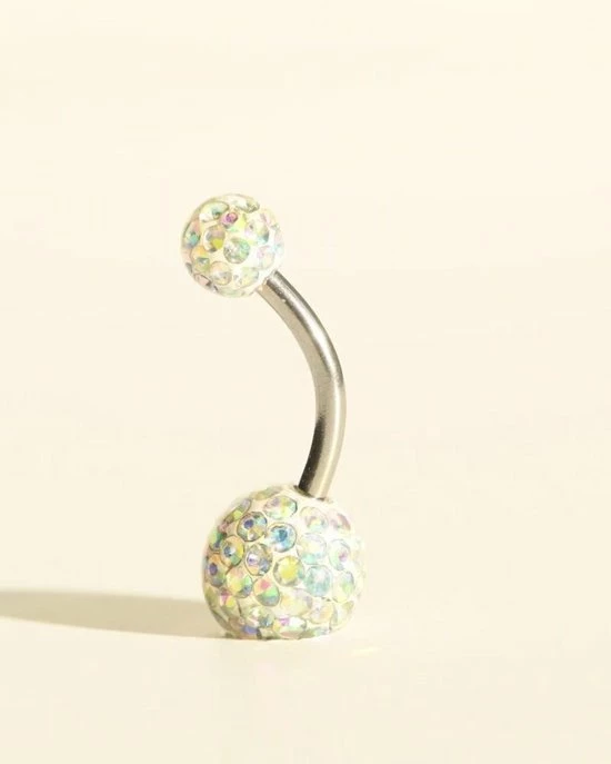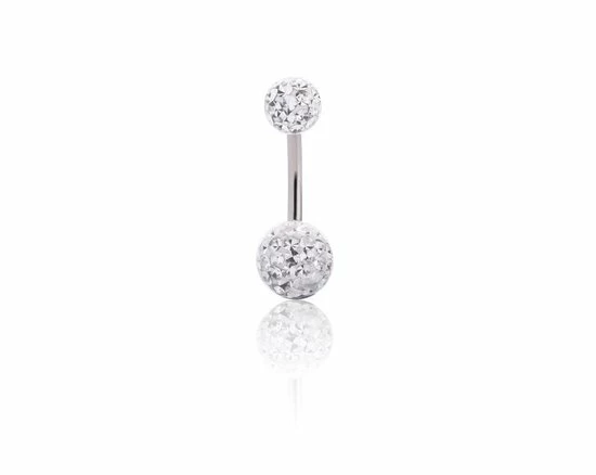 Deze prachtige navelpiercing is ingelegd met helderwitte Swarovski Elements. Het staafje heeft een dikte van 1,6mm en de lengte is 10mm. Daarnaast is het geheel voorzien van een afschroefbaar balletje, welke ook ingelegd is met Swarovski Elements. De balletjes hebben diameters van 5mm en 8mm.