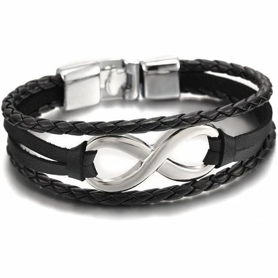 Deze stoere Infinty armband is afgewerkt met gevlochten leer, een strak gepolijste stalen bedel en een stalen sluiting. Een toffe armband voor de stoere man! Goed te combineren met een horloge met zwarte band of juist in contrast met een van onze stalen armbanden .