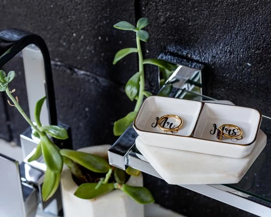 Onze Verre Esprit Mr en Mrs Ringenhouder is het perfecte cadeau-idee voor koppels! De sieradenopberger is gemaakt uit kwaliteitsvol keramiek met handgeschilderde gouden accenten. De juwelenhouder is 11.5 x 5.5 x 2 cm, wat de sieradenschotel perfect maakt voor het opbergen van ringen, kettingen, oorbellen of zelfs sleutels. Daarbovenop wordt elke houder geleverd in een met goudfolie bestempelde geschenkdoos.