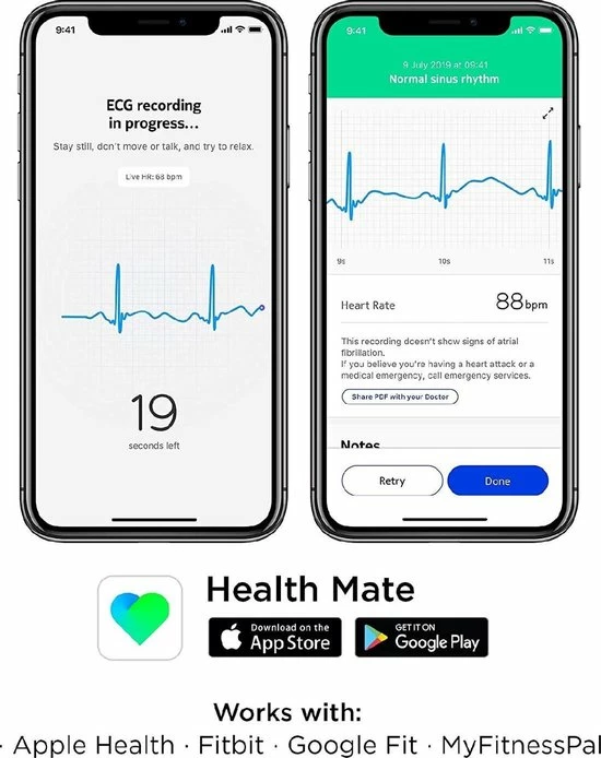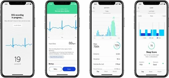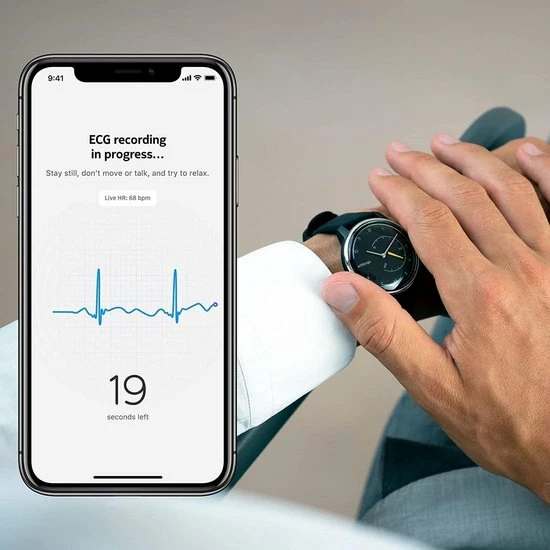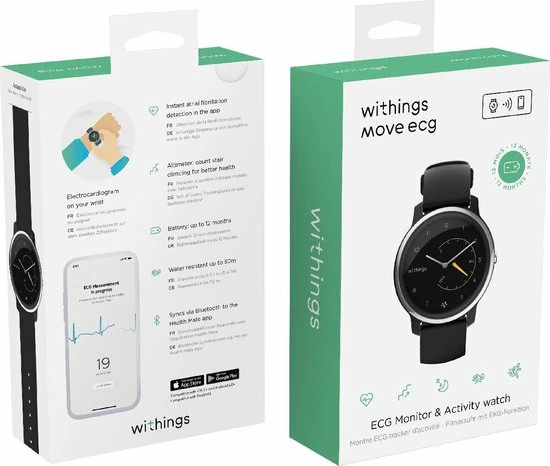 De Withings Move ECG is ’s werelds eerste analoge horloge dat een elektrocardiogram (ECG) opneemt op aanvraag en detecteert atriumfibrilleren via de Health Mate-app. Atriumfibrilleren is een serieuze vorm van een onregelmatig hartritme, bekend als een belangrijke risicofactor voor een beroerte. Een ECG opnemen kan eenvoudig door eenmaal op de knop te drukken en beide zijden van de roestvrijstalen ring op de top van het horloge aan te raken.