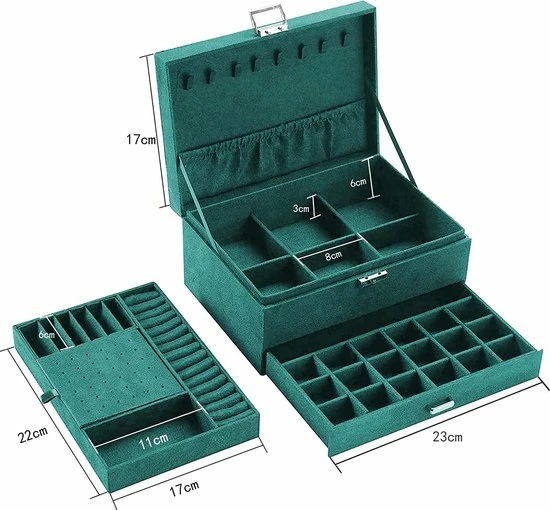 - Inhoud levering: een sieradendoosje met 2 verdiepingen, de afmetingen bedragen 24 x 17 x 11,5 cm. Een lade en een sleutel die je sieraden een thuis geeft, en jou een geweldig decoratie- of cadeau-idee geeft.