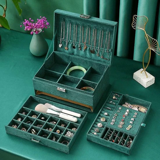 Beste Verkoop π Withosent Sieradendoos, Sieradendoosje Van Fluweel Met 2 Niveaus, Sieradendoos Voor Dames, Sieradendoos Voor Ringen, Oorbellen, Halskettingen En Horloges, Met Slot En Sleutel, Donkergroen β€οΈ